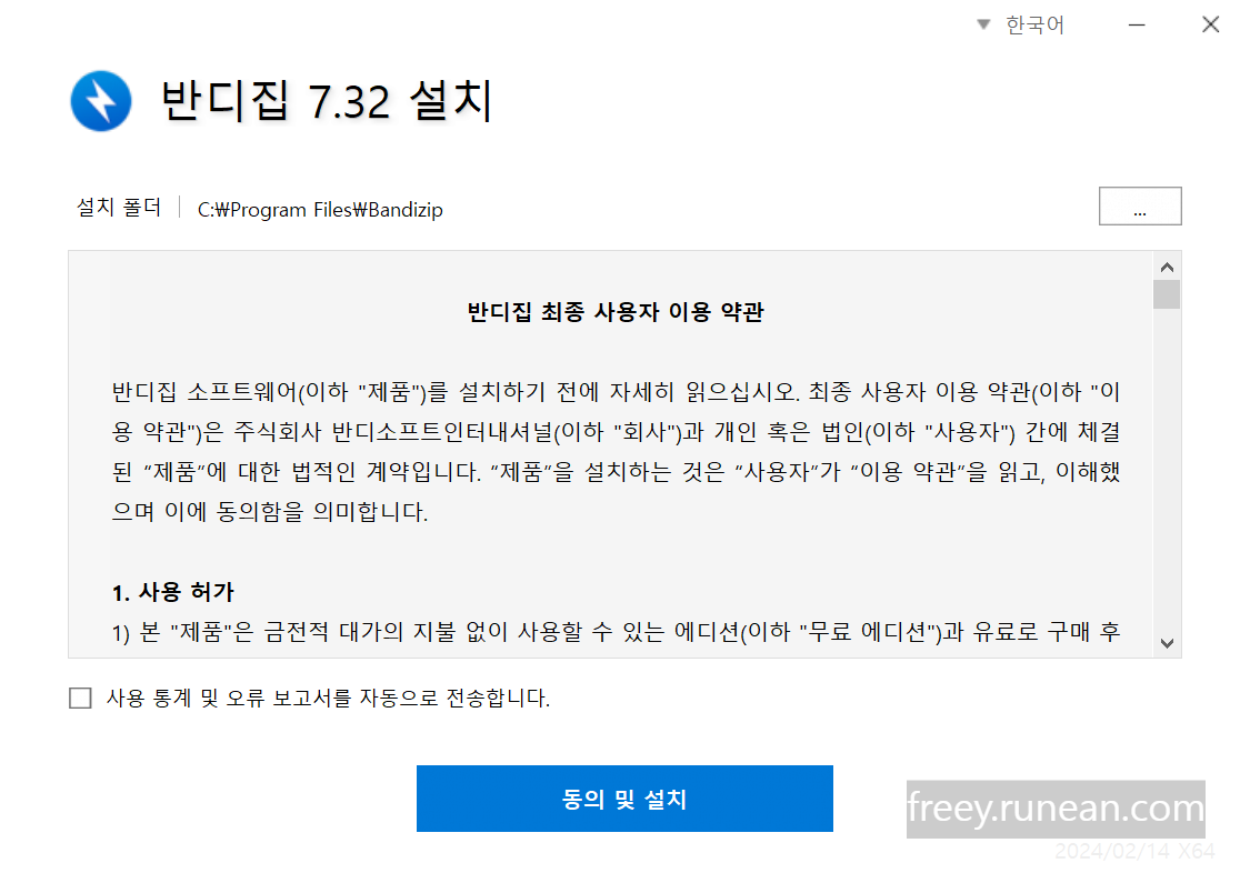 4. 라이선스 동의 및 설치 시작: 사용자 라이선스 계약서(EULA)를 읽고, 동의한다면 "동의 및 설치" 버튼을 클릭합니다. 하단의, "사용 통계 및 오류 보고서를 자동으로 전송합니다."는 체크할 필요 없습니다.